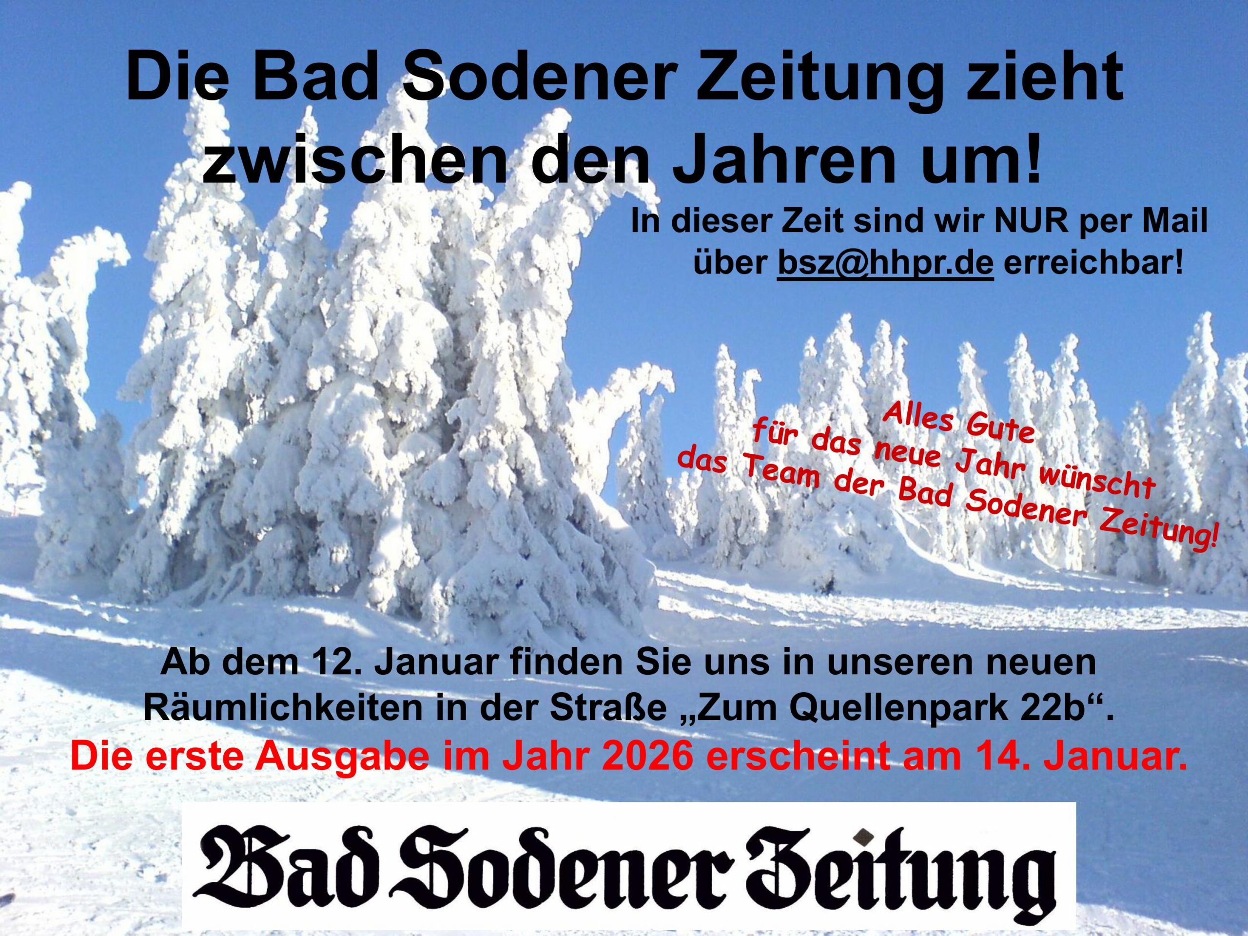 Die Bad Sodener Zeitung ist die einzige lokale Wochenzeitung in der Stadt Bad Soden mit den Stadtteilen Neuenhain und Altenhain und erscheint jeden Mittwoch.