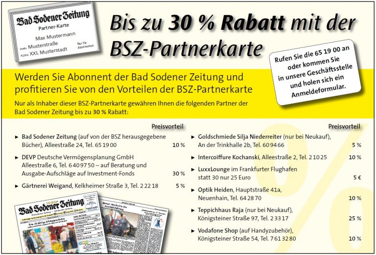 Werden Sie Abonnent der Bad Sodener Zeitung und profitieren Sie von den Vorteilen der BSZ-Partnerkarte.