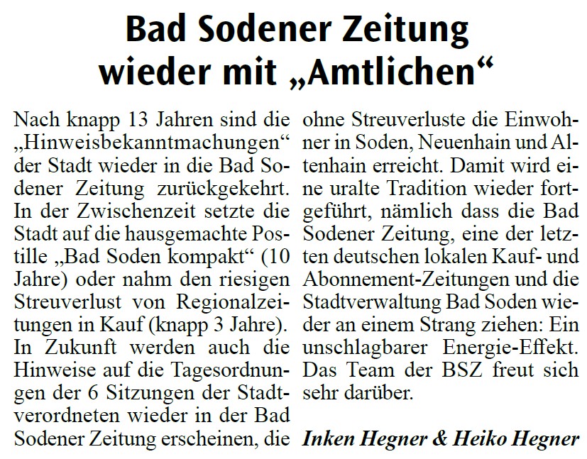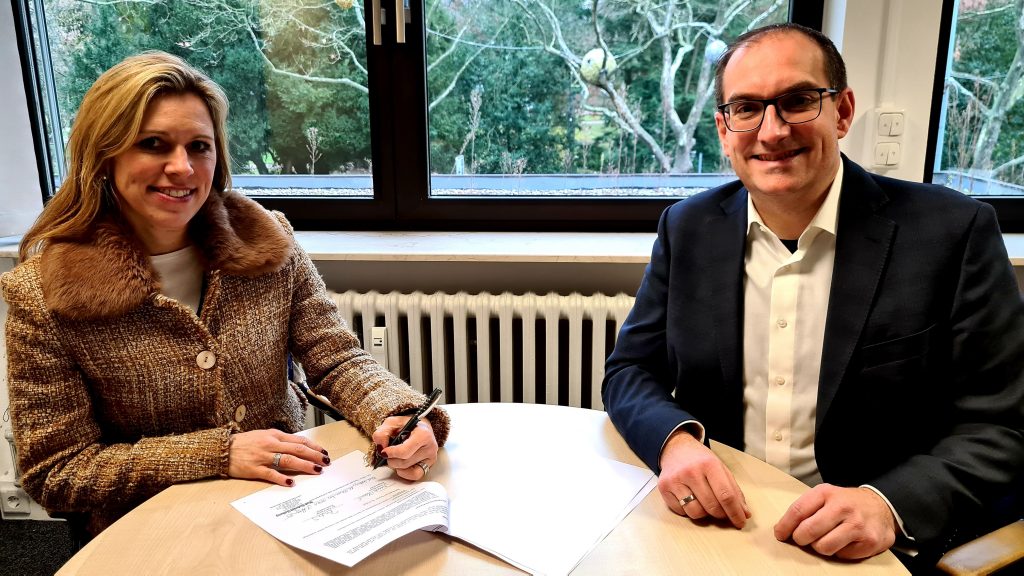 BSZ Geschäftsführerin Inken Hegner und Bürgermeister Dr. Frank Blasch unterzeichneten Ende Dezember 2021 den Vertrag zur Veröffentlichung der Hinweisbekanntmachungen der Stadt Bad Soden.